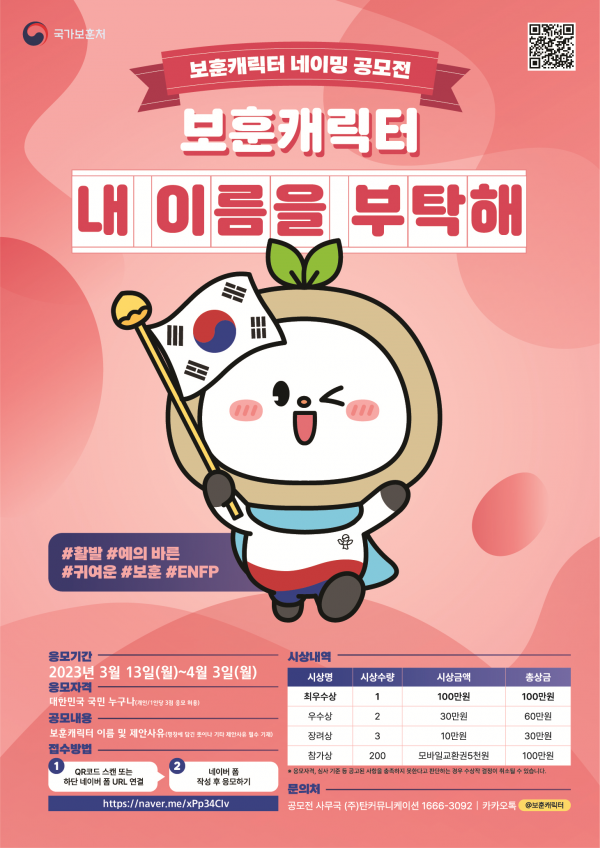 이번 공모전은 이러한 보훈캐릭터가 보훈의 정체성을 잘 나타내고 국민들에게 두루 사랑받는 이름을 선정하기 위해 마련됐다.