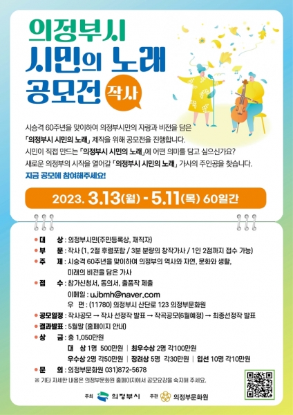 [금요저널] 의정부시는 3월 13일부터 5월 11일까지 60일간 ‘의정부시 시민의 노래 작사 창작 공모’를 진행한다.