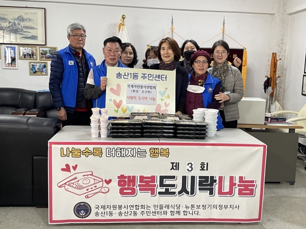 이성희 송산1동장은 “따뜻한 나눔의 손길을 건네주신 국제자원봉사연합회에 감사드리며 기부해주신 도시락은 도움이 필요한 이웃들에게 전달할 예정이다”고 밝혔다.