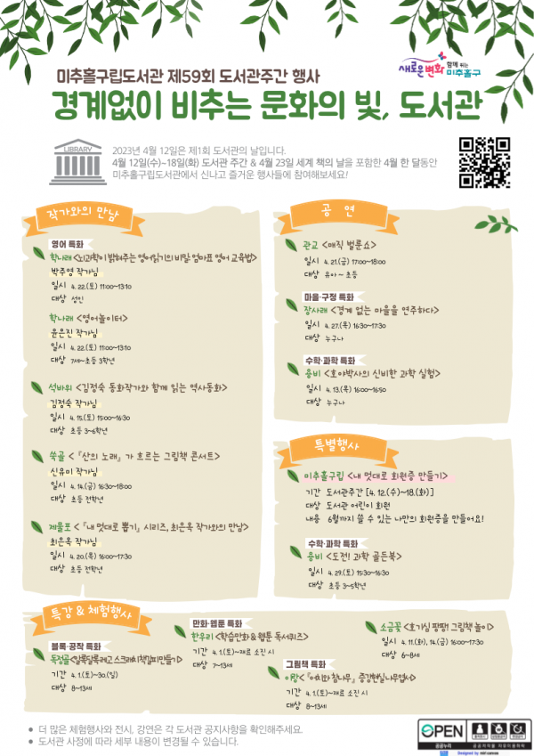 [금요저널] 인천 미추홀구 구립도서관은 "경계 없이 비추는 문화의 빛, 도서관"이라는 제59회 도서관주간 공식 표어 아래, 신나고 즐거운 행사를 4월 내내 운영한다.