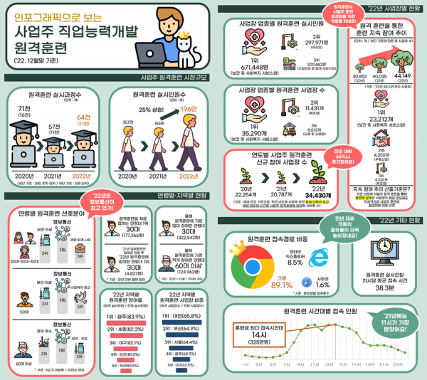 [금요저널] 한국산업인력공단은 2022년도 사업주 직업능력개발 원격훈련 현황의 인포그래픽 안내자료를 발표했다.