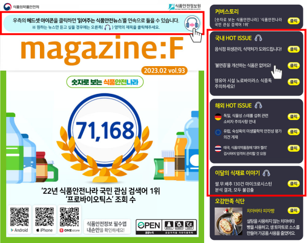 올해는 식품안전나라 월간지인 ‘매거진F’에서 ‘국내·외 핫이슈’와 계절별 식품 안전정보 등 ‘이달의 식재료 이야기’를 매달 선정해 음성으로 정보를 읽어주는 서비스를 시범적으로 제공한다.