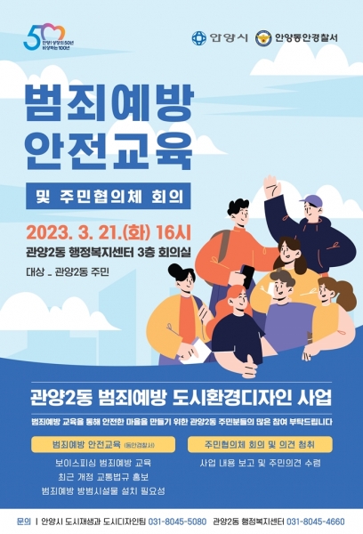 [금요저널] 안양시가 관양2동 주민들을 대상으로 오는 21일 범죄예방 안전교육 및 주민협의체 회의를 관양2동 행정복지센터에서 개최한다고 15일 밝혔다.