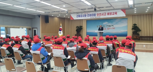 이날 교육은 건조한 날씨가 지속되어 크고 작은 봄철 산불 발생 위험이 증가하는 시기를 맞아 산불감시 및 진화작업에 직접 투입되는 산불전문예방진화대원과 산불감시원들에게 산불 진화의 전문성과 안전의식을 높이기 위해 마련됐다.