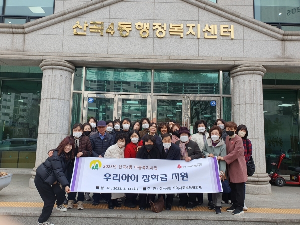 박영숙 산곡4동 지역사회보장협의체 위원장은 “크지 않은 액수지만 어려운 주민들을 위해 지역 주민들이 십시일반 기부해준 후원금으로 장학금 지원 사업을 할 수 있게 됐다”며 “기부에 참여해준 후원자분들에게 감사하며 어려운 가정에 잘 전달하겠다”고 말했다.