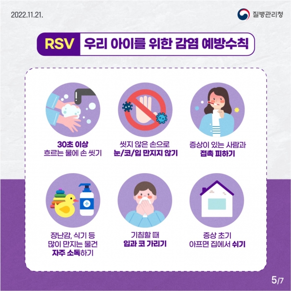 호흡기세포융합바이러스 감염증은 콧물, 인후통 등 주로 상기도 감염증상으로 나타나지만, 영유아 등 면역저하자에게 모세기관지염이나 폐렴 등 하기도 감염을 일으킬 수 있어 주의가 필요하며 또한 감염된 사람과의 접촉이나 호흡기 비말을 통해 쉽게 전파되므로 산후조리원이나 영유아 보육시설 등에서는 감염 예방을 위한 철저한 관리가 필요하다.