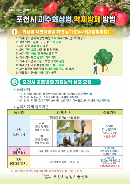 포천시는 관내 사과·배 재배 농가를를 대상으로 1억1600만원을 지원해 과수화상병 방제 약제 3종과 살포 요령 안내서를 농가에 공급했다.