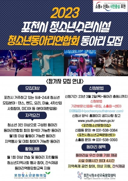 포천시 청소년수련시설은 청소년들이 지역 내 일원으로서 공동체 의식과 지역에 대한 애향심 함양, 건전한 방과 후 문화 형성, 청소년의 놀이 및 활동 공간 제공, 청소년 재능개발 및 역량강화의 기회를 제공하기 위해 동아리를 모집한다.