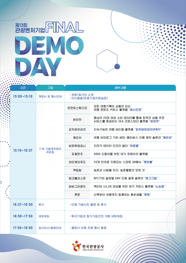 [금요저널] 문화체육관광부와 한국관광공사는 오는 3월 28일 오후 3시, 공사 서울센터 15층에서 ‘제13회 관광벤처 파이널 데모데이’를 개최한다.
