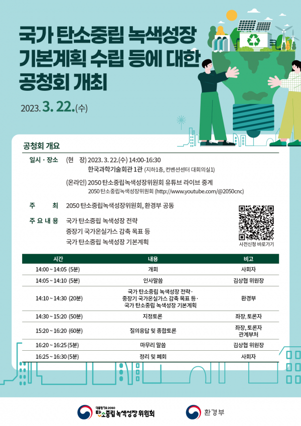 3월 22일 공청회에는 김상협 탄녹위 민간위원장을 비롯한 관계부처 담당자들이 참석해 국민들의 의견을 적극 수렴할 계획이며 탄소중립·녹색성장 관련 국내 산·학·연 전문가, 시민단체 관계자들의 국가계획에 대한 심도 있는 패널토론과 함께 청중들과의 질의응답이 진행될 예정이다.