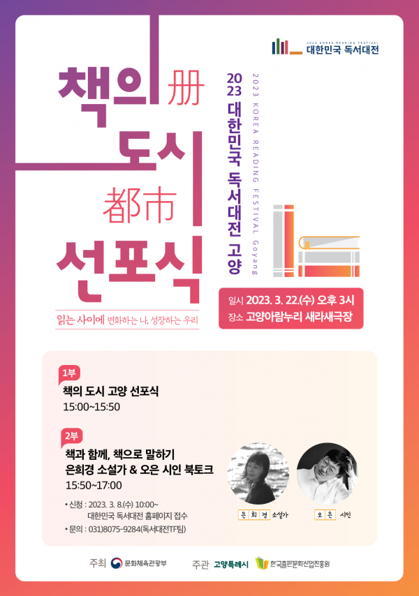 [금요저널] 국내 최대 독서 문화 축제인 ‘2023 대한민국 독서대전’의 개최지를 알리는 ‘2023 대한민국 책의 도시 선포식’이 3월 22일 오후 3시, 고양특례시 고양아람누리 새라새극장에서 열린다.