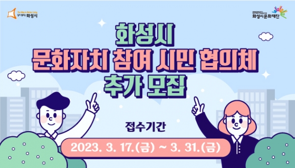 [금요저널] 화성시문화재단은 3월 17일부터 31일까지 지역의 문화정책 수립 및 집행 과정에 시민이 직접 참여하는 ‘화성시 문화자치 시민 협의체 위원을 추가 모집한다고 밝혔다.