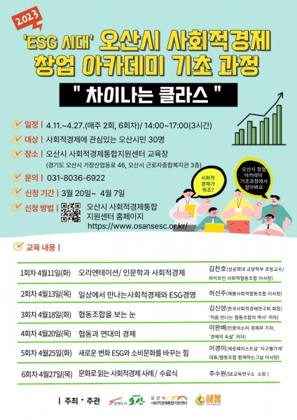 [금요저널] 오산시는 4월 7일까지‘2023년 사회적경제 창업아카데미 기초 과정’수강생을 모집한다고 밝혔다.