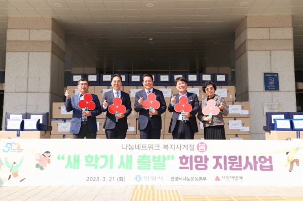 [금요저널] 안양시는 지난 21일 시청 정문에서 ‘복지사계절 사업’으로 저소득가정의 아동을 위한 새 학기 지원 물품을 마련하고 전달식을 개최했다고 22일 밝혔다.