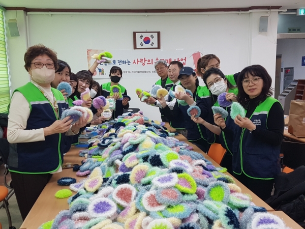 [금요저널] 정왕3동 지역사회보장협의체는 지난 21일 복지 사각지대 발굴 홍보를 위한 친환경 손뜨개 수세미 2,000점을 직접 만들어 기부했다.