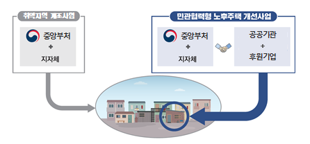 정부는 기본적인 생활여건이 확보되지 않은 도시 내 낙후지역을 지원하는‘도시 취약지역 생활여건 개조사업’이 재정지원 중심으로 시행되는 한계를 개선하기 위해 '18년부터‘민관 협력형 노후주택 개선사업’을 함께 추진해 오고 있다.
