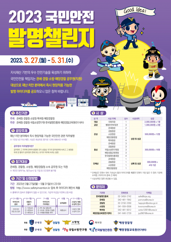[금요저널] 소방청은 관세청, 경찰청, 특허청, 해양경찰청과 함께 지식재산 기반의 우수 안전 기술 육성을 위한‘2023 국민안전 발명챌린지’아이디어 접수를 3월 27일부터 5월 31일까지 진행한다.
