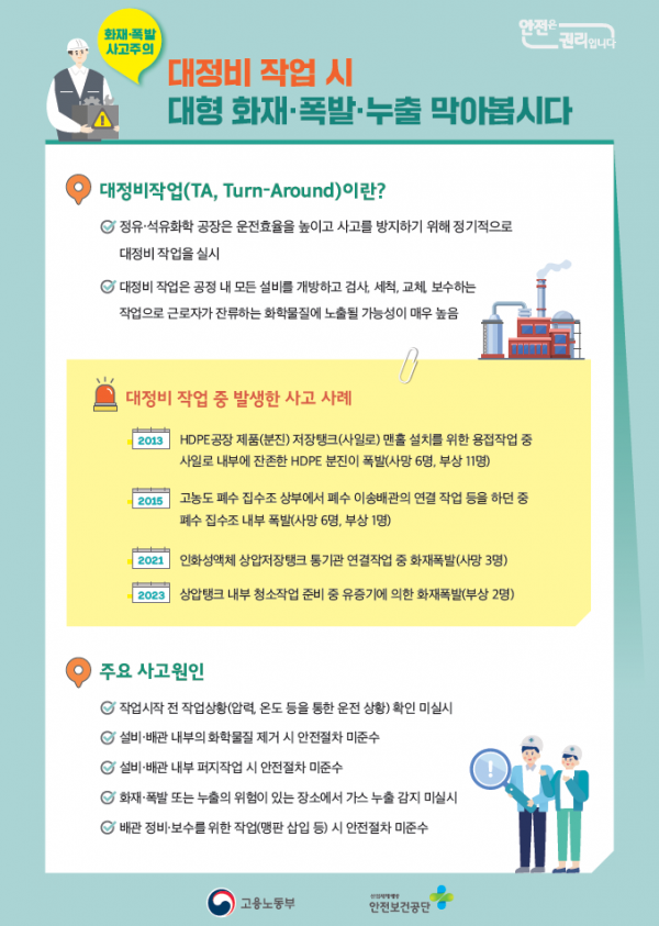 한편 고용노동부는 이번에 마련한 ‘대정비 작업 사고사례 및 안전작업절차’ 자료를 전국 정유·석유화학 공장 등에 배포하고 고용노동부 및 안전보건공단 누리집에 게시해 누구나 내려받아 사용할 수 있도록 했다.