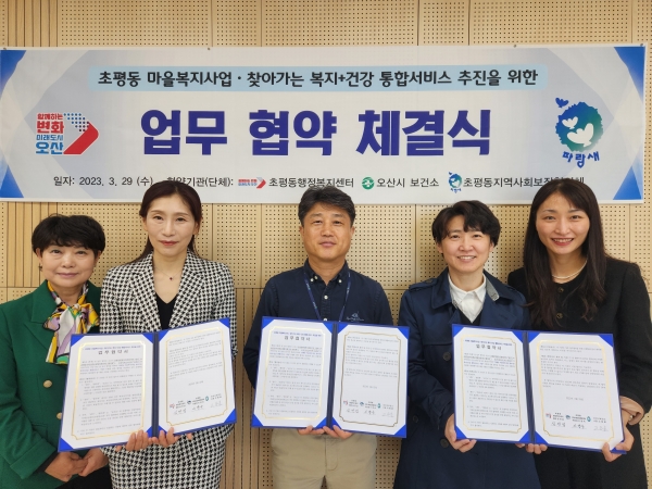 [금요저널] 오산시 초평동이 지난 29일 동 마을복지사업 및 찾아가는 ‘복지+건강 통합서비스’추진을 위해 오산시보건소, 초평동지역사회보장협의체와 업무 협약을 맺었다.