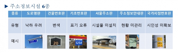 신고 대상은 기존에 설치된 건물번호판이 탈색 또는 변색되어 알아보기 어렵거나 표기 오류 또는 오염된 도로명판, 기초번호판, 사물주소판, 주소정보안내판, 국가지점번호판 등 모든 주소정보시설이 해당되며 훼손된 주소정보시설의 사진을 찍어 안전신문고에 누구나 신고할 수 있다.