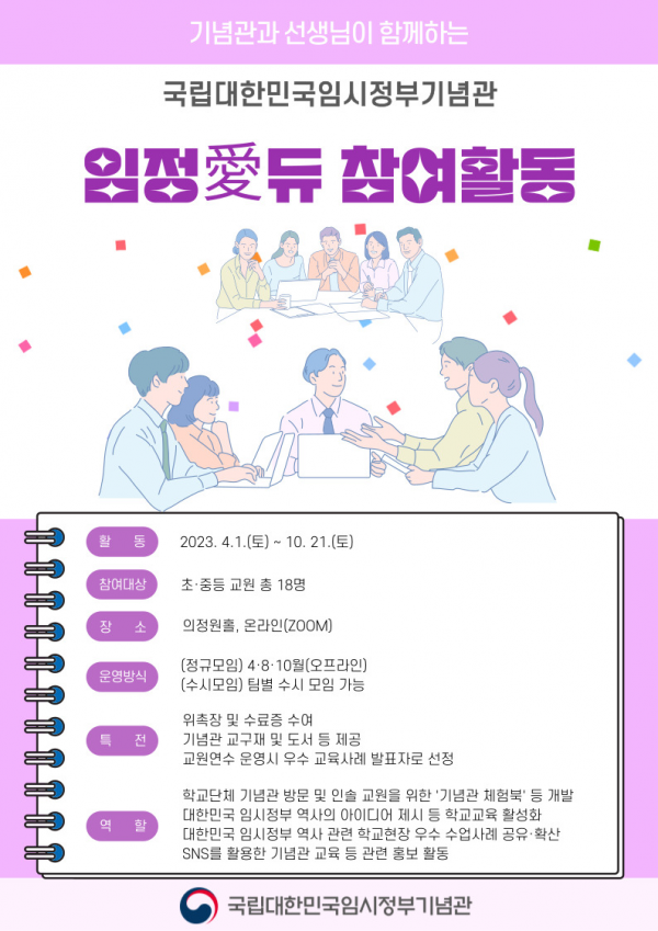 ‘임정애듀’는 최근 한 달간 공모를 통해 선발된 초·중등 교사 18명이 참여하게 되며 임시정부기념관과 교사들은 학교 현장과 기념관에서 쉽게 활용할 수 있는‘기념관 체험북’을 개발할 예정이다.