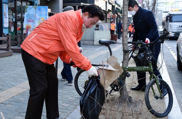 ‘쾌적한 동네를 위한 오늘의 한걸음’이라고 쓰인 어깨띠를 두르고 집게와 봉투를 든 채, 동부권 쓰레기 특별관리지역인 민락2지구 로데오거리 인근 총 3,000m 도로와 공공시설물 주변의 쓰레기를 줍고 무단투기 근절을 홍보했다.