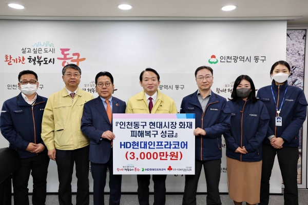 HD현대인프라코어, 두산밥캣, 현대제철은 지난 30일 동구를 방문, 현대시장 화재 피해 복구를 위한 성금 1억원을 전달했다.