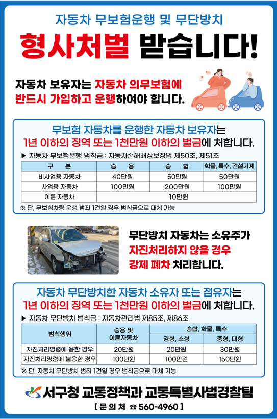 자동차 무단방치 행위는 도시 미관을 해치며 주민 통행 불편, 주차난을 가중하고 무보험 운행은 교통사고 발생 시 상대방에게 피해 보상을 할 수 없는 등 구민 안전을 크게 위협하고 있다고 서구는 설명했다.