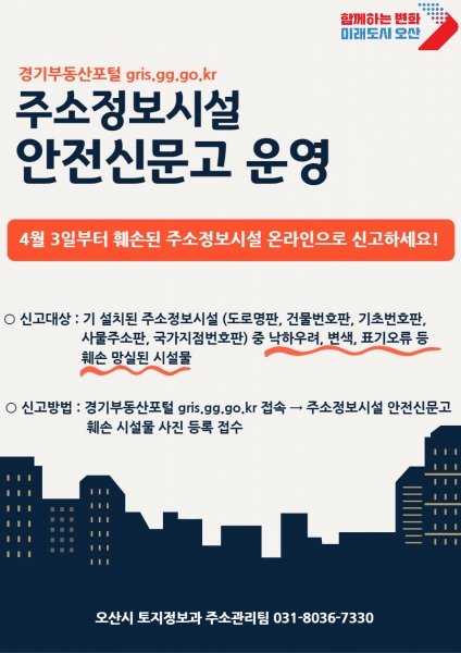 [금요저널] 오산시는 4월 3일부터 경기부동산포털 주소정보시설 안전신문고를 통해 훼손 · 망실되어 정비가 필요한 시설물을 온라인으로 신고받는다고 밝혔다.