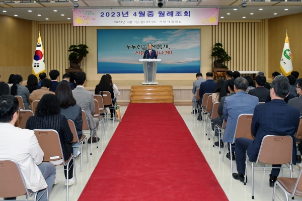 이날 월례조회에는 우종학 명예시장을 비롯해 전 직원이 참석한 가운데 식전공연으로 일자리경제과 김두리 주무관이 노래 공연을 선보여 직원들의 환호를 받았다.