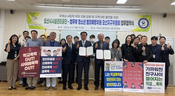 [금요저널] 오산시시설관리공단은 지난 3일 법무부 청소년 범죄예방위원 오산지구위원회와 학교폭력 예방 업무협약을 체결했다.