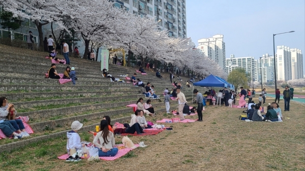 반대편이 보이지 않을 만큼 흐드러진 벚꽃길 아래로 삼삼오오 모인 시민들은 돗자리 위에 앉아 천천히 쉬면서 벚꽃이 가득한 호원동 벚꽃길을 즐겼다.