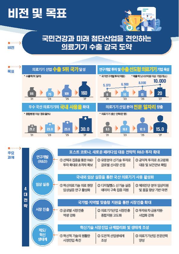 정부는 그간의 기술 추격형 산업구조를 글로벌 선도형 산업으로 패러다임을 전환해 의료기기 글로벌 수출강국으로 도약을 위해 비전과 목표를 설정하고연구개발부터, 임상실증 지원, 시장진출, 규제합리화까지 4대 전략 12대 중점 추진과제를 마련했다.