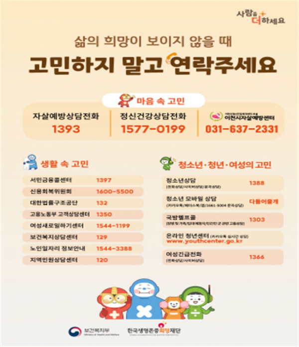 이천시자살예방센터는 자살 고위험군 상담 자살 예방 교육 생명사랑치료비 지원 자살수단 통제사업 게이트키퍼 교육을 운영하고 있으며 주변에 자살 위험성이 있다고 판단되는 사람이 있을 때 이천시자살예방센터에 도움을 요청하면 된다.