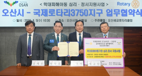 [금요저널] 오산시가 국제로타리3750지구와 지난 5일 시청 상황실에서 학대 피해 아동과 가족의 회복을 도모하고 심리·정서 지원사업 추진을 위한 업무협약을 맺었다.