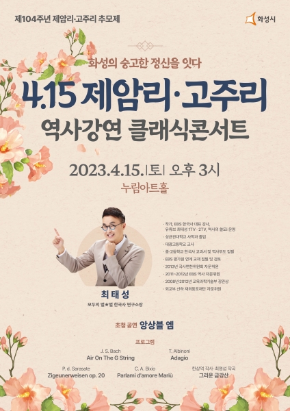 이번 콘서트는 ‘큰별쌤’으로 알려진 EBS 한국사 대표강사 최태성 작가가 초청돼 화성4.15 제암리·고주리 학살사건을 주제로 우리가 기억해야 할 화성독립운동가분들과 그들을 계승하기 위해 우리가 무엇을 해야 하는지를 소개할 예정이다.