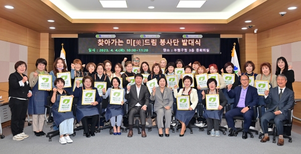 이날 발대식은 봉사단 회원 소개와 선서문 낭독이 이뤄졌으며 차준택 구청장이 장춘화 대한미용사회중앙회 부평구지회장에게 미드림 봉사단 표지판을 대표로 전수했다.