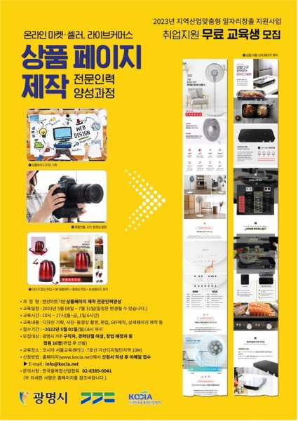 교육비는 전액 무료이며 교육내용은 디자인 기획 사진 연출과 촬영 이미지 편집 및 합성 상세 페이지 디자인 등이다.