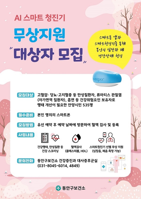 [금요저널] 안양시 동안구보건소는 스마트 청진기를 활용해 건강행태 개선에 참여할 대상자를 모집한다고 7일 밝혔다.