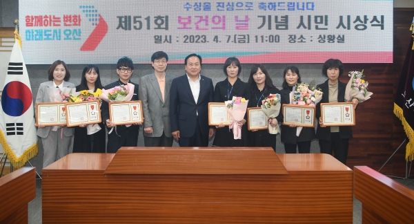 [금요저널] 오산시는 7일 시청 상황실에서 ‘제51회 보건의 날 기념 시민시상식’을 개최하고 코로나19 대응과 시민 건강증진, 보건의료 분야 발전에 기여한 유공자 9명에게 표창장을 수여했다.