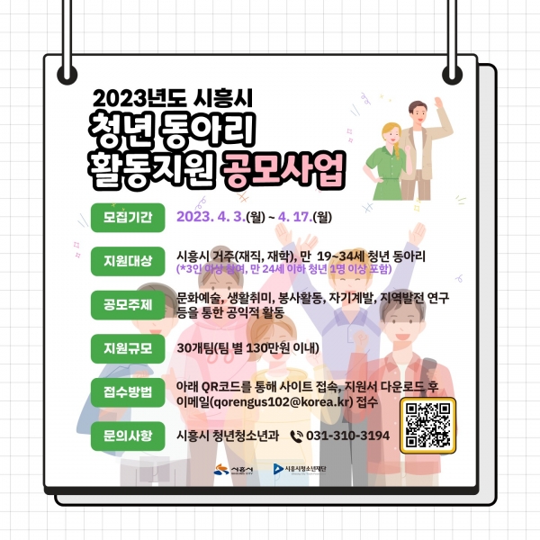 [금요저널] 시흥시는 시흥시청소년재단과 협력해 청년커뮤니티 활성화를 위한 ‘2023년 청년동아리 활동 지원 공모사업’을 오는 5월부터 추진한다.