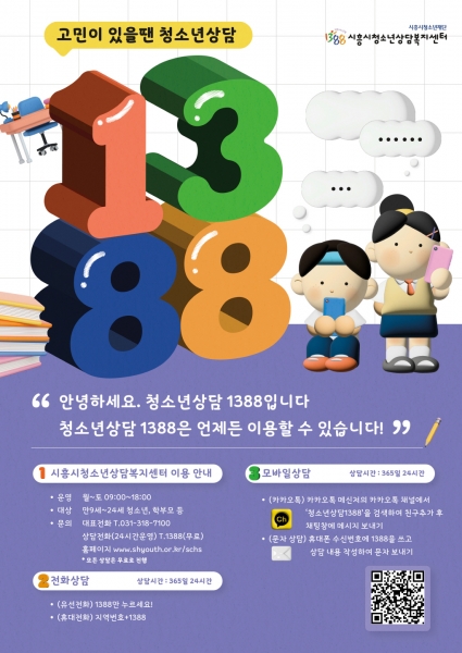 또한, 시흥시청소년상담복지센터는 문자, 전화, 페이스북, 카카오톡 등으로 상담이 가능한 1388청소년상담을 적극 홍보하며 청소년전화 1388 운영, 각종 심리검사, 청소년들의 개인 및 집단상담, 학교폭력예방교육 등을 통해 안전하고 건강한 사회구성원으로 성장할 수 있도록 다방면으로 노력하고 있다.