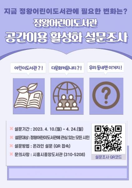 [금요저널] 시흥시 중앙도서관은 4월 10일부터 24일까지 시흥시 유일의 어린이도서관인 정왕어린이도서관의 공간 이용 활성화를 위해 시민을 대상으로 설문조사를 진행한다.