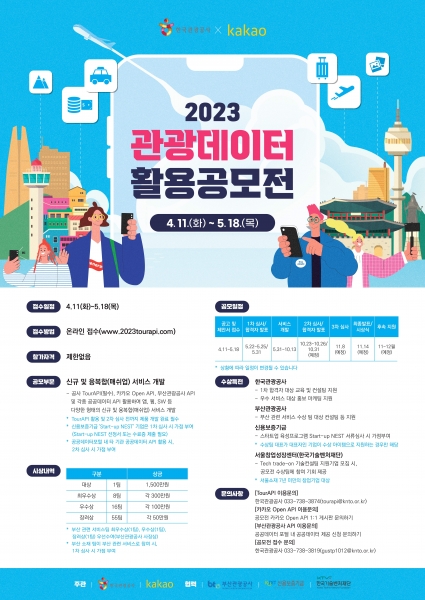 [금요저널] 한국관광공사와 ㈜카카오는 빅데이터, AI, 온라인플랫폼 등 디지털 기반 여행소비 급증 및 맞춤형 서비스 요구에 부합하는 새로운 관광서비스 개발을 위해 ‘2023 관광데이터 활용 공모전’을 개최한다.
