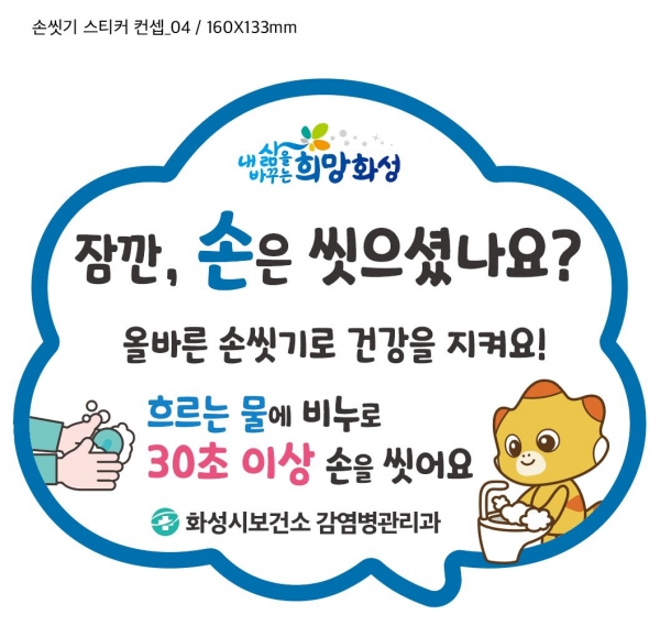 우선 10일부터 14일까지 ‘손 씻기 적극 홍보주간’으로 정하고 관내 학교, 어린이집, 유치원, 화성도시공사, 관공서 화성노인회 등 총 2천 120개소에 손 씻기 안내물을 배포했다.