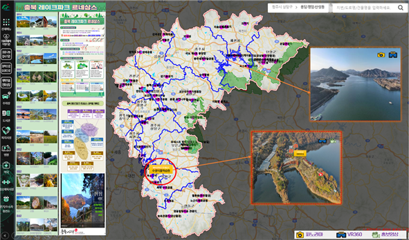 충청북도의 ‘충북 레이크파크 르네상스 구현을 위한 충북형 공간정보 구축’ 사업은 도내 호수·저수지 주변 관광지를 고품질 가상현실과 3차원으로 공간정보로 구축해 체험형 모바일 서비스 및 관광 콘텐츠 개발에 활용하는 사업이다.