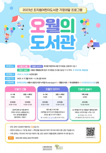[금요저널] 세종특별자치시가 조치원 어린이도서관의 가정의 달 프로그램으로 오는 17일부터 ‘오월의 도서관’ 수강생을 모집한다.