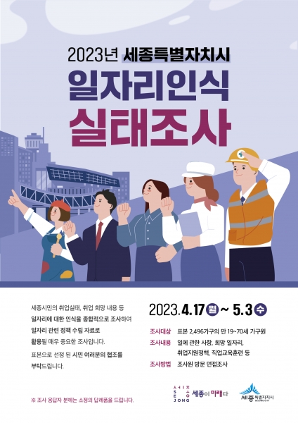 [금요저널] 세종특별자치시가 오는 17일부터 5월 3일까지 표본 2,500가구를 대상으로 ‘세종시 일자리인식실태조사’를 실시한다.