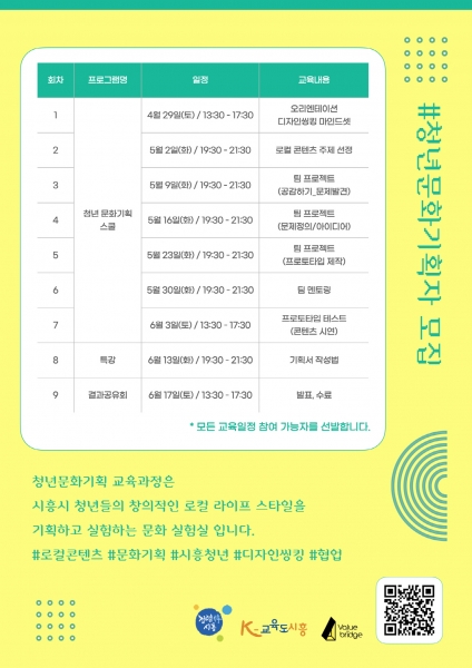 또한, 시흥시청 누리집에 접속해 ‘시정소식-시정정보-새소식’에서 청년문화기획 교육과정에 대한 자세한 사항을 확인할 수 있다.