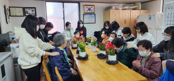 이호순 신한2차아파트경로당 회장은 “봄이지만 거동이 불편해 꽃구경을 가지 못하는 어르신들이 계시는데 손자, 손녀 같은 아이들이 찾아와서 화분도 같이 만들고 안마도 해 줘서 너무 좋다”고 말했다.